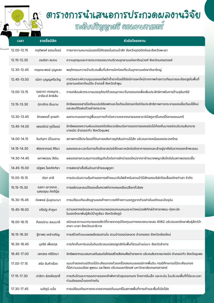 กิจกรรมดังกล่าวจัดขึ้นเพื่อเปิดโอกาสให้นิสิตระดับปริญญาตรีได้นำเสนอผลงานวิจัย แลกเปลี่ยนองค์ความรู้ และพัฒนาทักษะการสื่อสารทางวิชาการ จึงขอเชิญชวนทุกท่านร่วมเป็นกำลังใจให้กับนิสิต และร่วมรับฟังผลงานวิจัยที่น่าสนใจ ซึ่งสะท้อนถึงศักยภาพและความมุ่งมั่นในการพัฒนางานด้านวนศาสตร์อย่างสร้างสรรค์